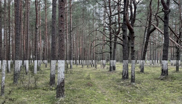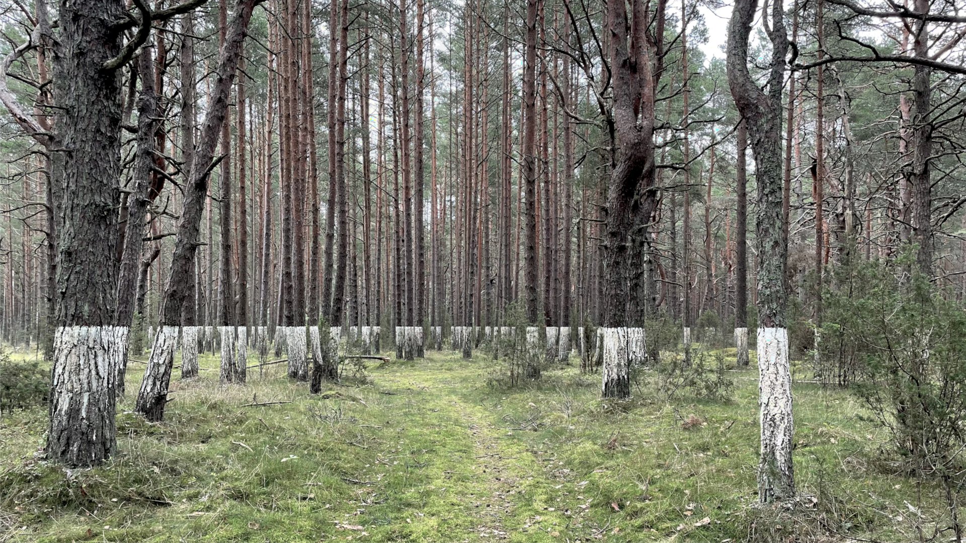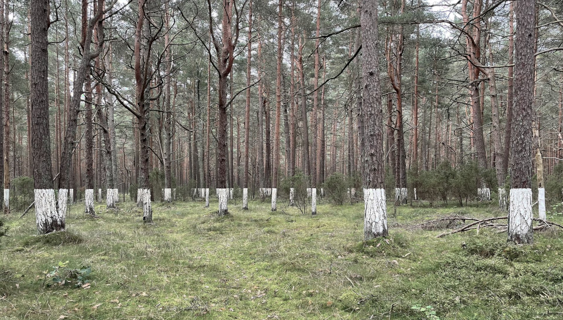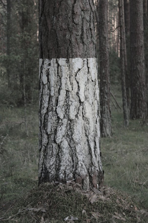 Artist Tomas Martišauskis invites to a point with specific coordinates in the pinewood in the locality of Šventoji (Lithuania), where he presents the site-specific installation Appropriate, which can be viewed live until the lime mixture naturally washes off the tree trunks.