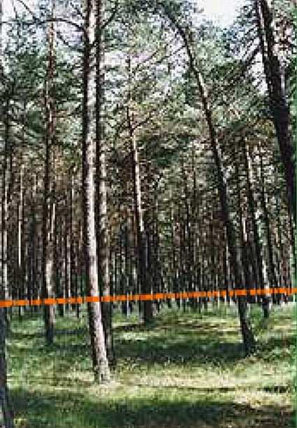 Critically reflecting on the problem of territory appropriation, the artist uses subtle marking to expose the human interference into and desire to ‘arrange’ and construct the environment that may not even be our property. The artist applies the trunk bleaching procedure, usually employed for garden fruit trees, to forest pines, thus upsetting the order between ‘domesticated’ and ‘wild’, garden and forest trees, the ‘owned’ and the ‘appropriated’. With this gesture, used in gardening to protect the tree bark from pests and other harmful factors, Martišauskis proposes a slightly different semantics of forest tree marking, dissociated from logging meanings and at least in this case capable of acting as a protection of observing pines from a distance.